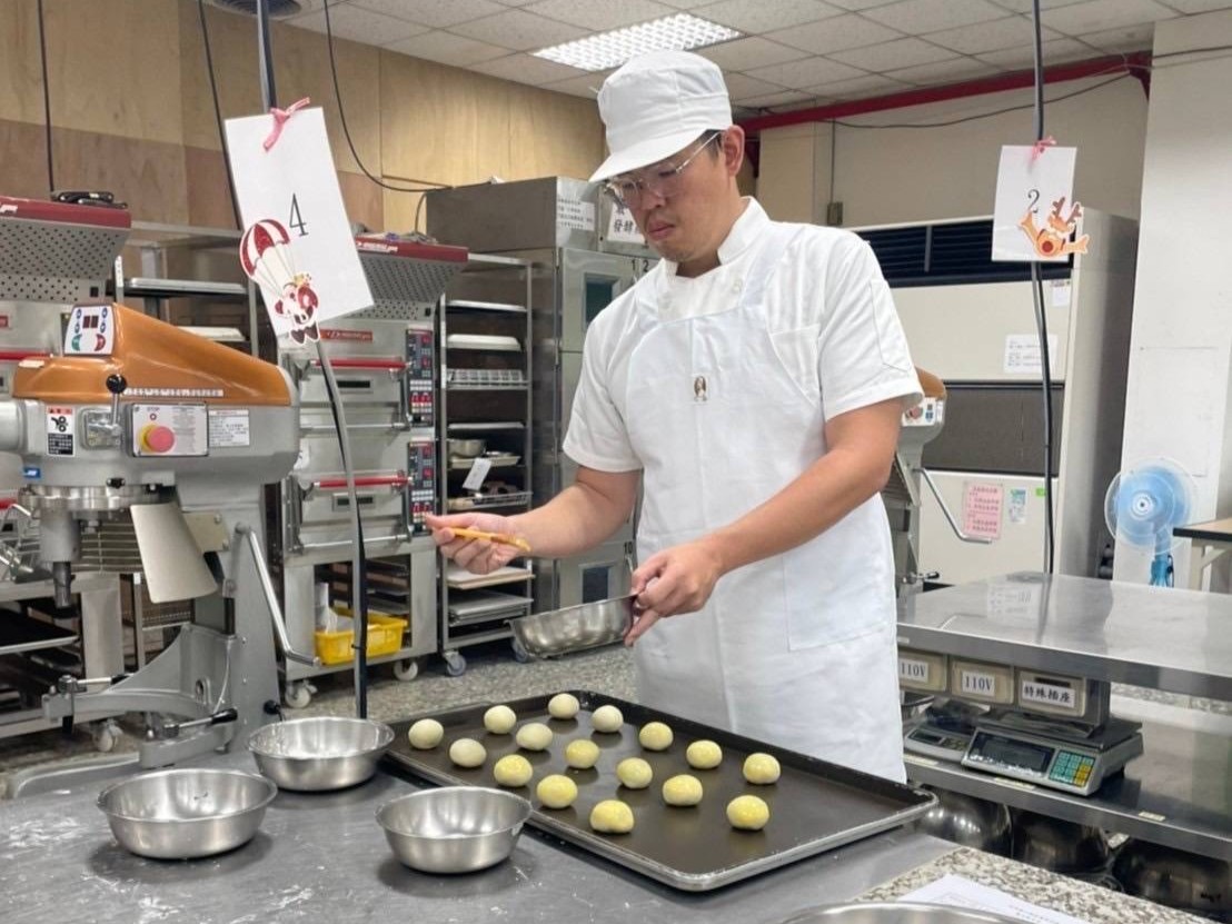 課程訓練時數達840小時,內容涵蓋產業概論與職業素養、創新產品製作、商業經營、食品安全衛生及多項烘焙實作技術。從發酵類產品、麵包與餅乾製作,到節慶產品及在地食材應用,均透過反覆實作建立穩定技術基礎;商業經營單元則教授成本計算、產品定價、行銷策略與產品攝影,協助學員建立市場觀念與品牌思維。蔡長庭並於訓練期間取得中式麵食與烘焙食品(餅乾類、麵包類)丙級技術士證照,強化專業能力與職場競爭力。