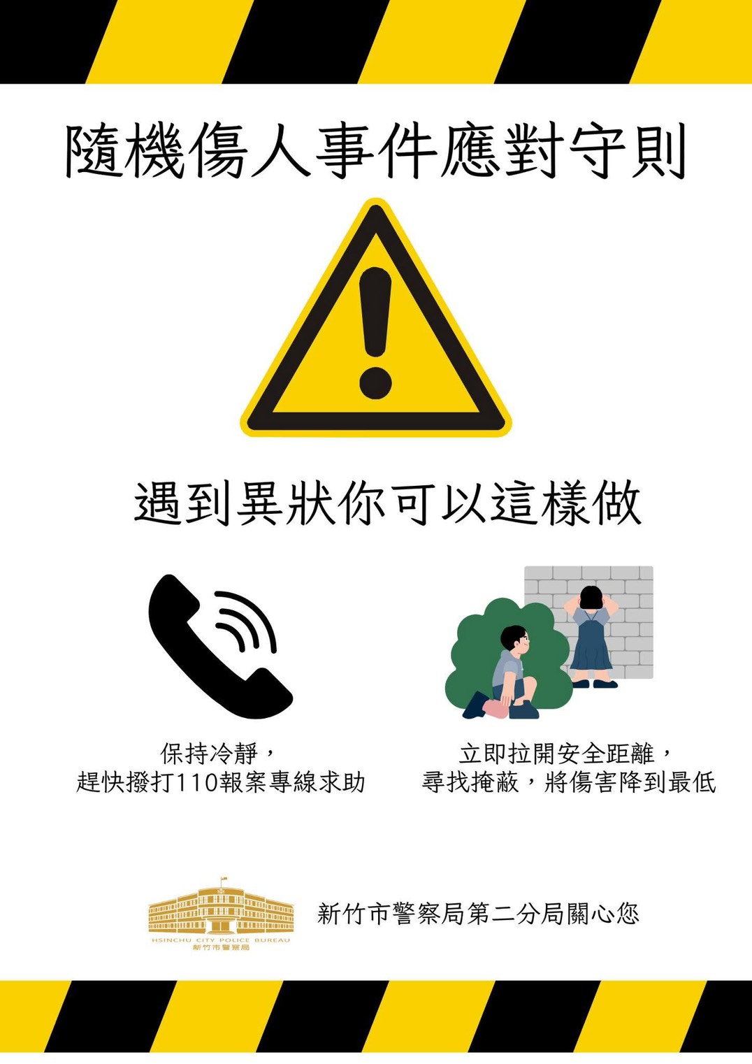 竹市警二分局分局長周貴忠特別提供分局自製宣導圖卡,提醒各位市民朋友,如遇到突發危急事件,除撥打110報案專線外,第一時間應立即拉開安全距離、尋找掩蔽,將傷害降到最低,轄區員警也會落實「報案快、到場快、處置快」原則,迅速到場,大膽正確執法,展現專業執法作為。