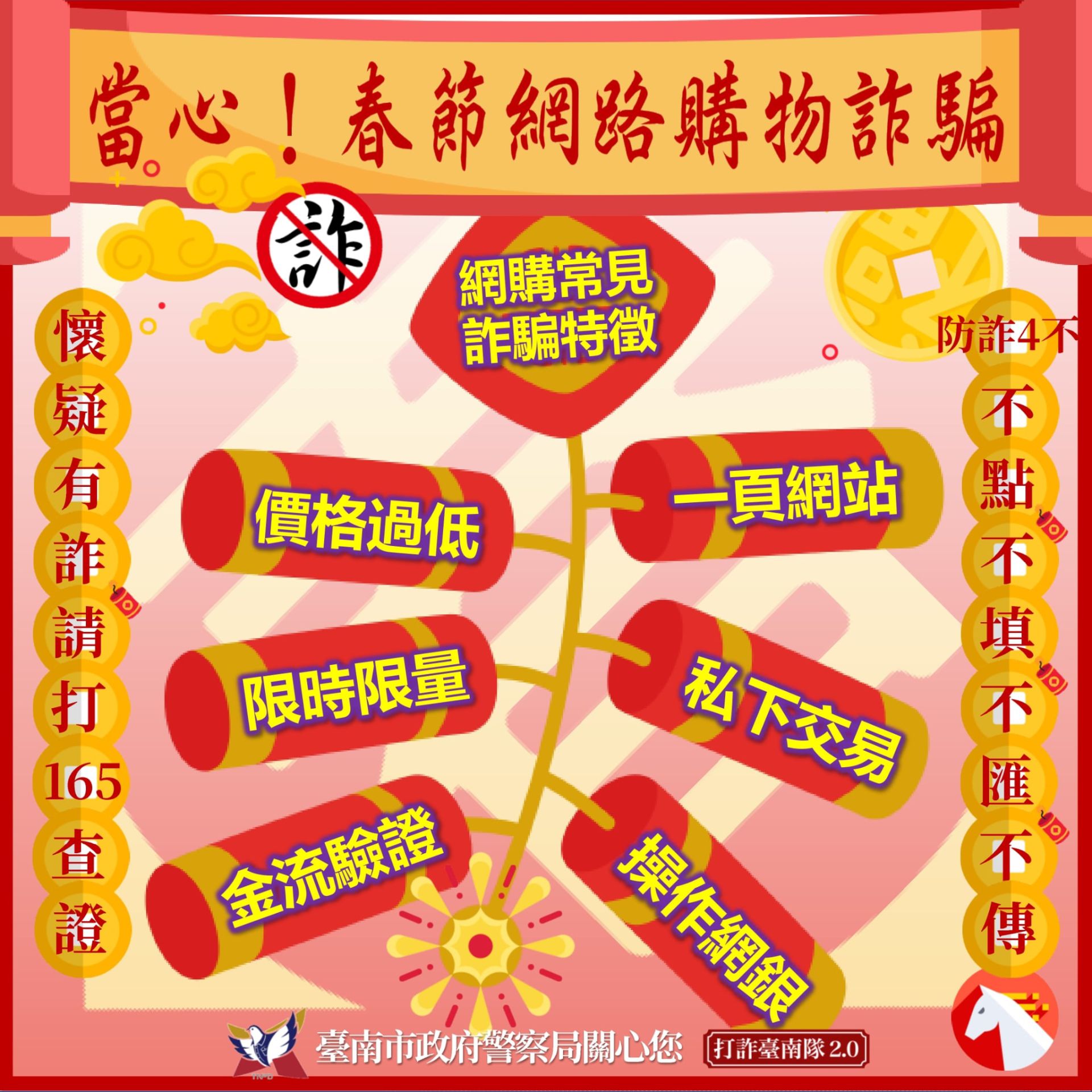 臺南市114年165受理詐騙案件件數,以假網購詐騙居冠、假投資詐騙第2名、假交友(投資詐財)詐騙第3名。春節往往是購物消費高峰期,南市警局及所屬各分局持續利用駐地跑馬燈、廣播電台與網路社群媒體等各式管道,利用文字訊息及圖卡,提醒民眾要保持防詐意識,上網購物應選擇合法有保障之平臺,並當心「實名制認證」、「身分認證」或「金流驗證」等詐騙話術。年假期間民眾上網時間增加,對於社群平臺之各式廣告要有警覺性,切勿輕易點擊,亦勿加陌生人臉書、LINE好友及投資群組,「保證獲利、穩賺不賠」就是詐騙話術,如發現疑似詐騙,請立即撥打165反詐騙專線諮詢或至內政部警政署165「打詐儀錶板」查詢相關資訊。