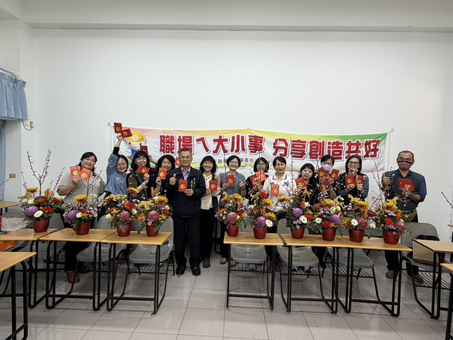 勞工局長王鑫基表示,南門勞工育樂中心持續開辦多元化的勞工學苑課程,其中結合藝文與美學元素的課程深受勞工朋友喜愛。「生活花藝」為系列課程之一,特別感謝蔡玉娟老師今日精彩的授課,為新的一年揭開充滿美感的序幕。後續課程將於3月14日、4月18日、5月16日及6月13日陸續辦理,期盼學員持續支持與踴躍參與。