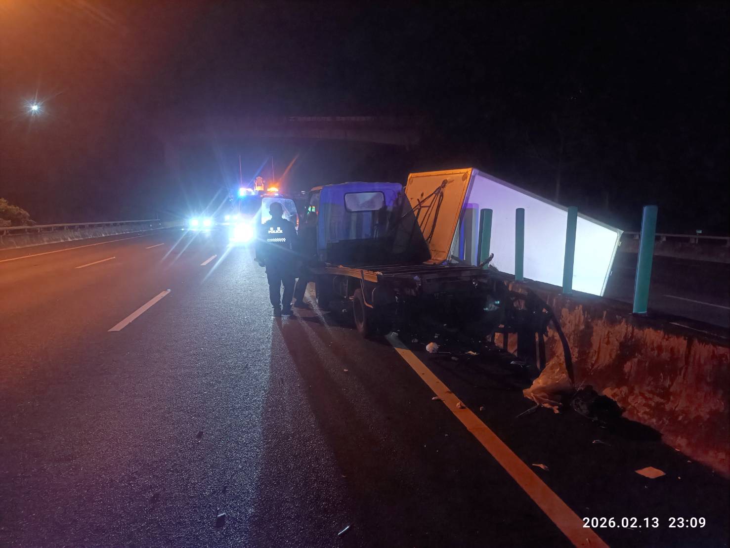 國道警察第五大隊表示,昨日22時30分,48歲吳姓男子駕駛自小客車行經國道3號南向385.6公里斜張橋路段,疑因恍神導致車輛由內向外偏移擦撞外側車道、58歲葛姓男子駕駛自小貨車。