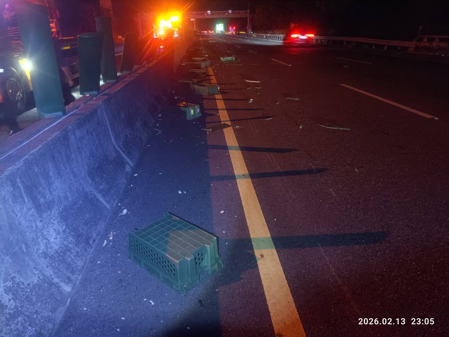 小貨車遭撞後失控撞擊內側分隔島,車身橫跨分隔島至對向內側車道,另現場有4部小客車因撞擊該事故之散落物造成車損。事故現場於23時56分排除,全案由竹田分隊依規定處理。