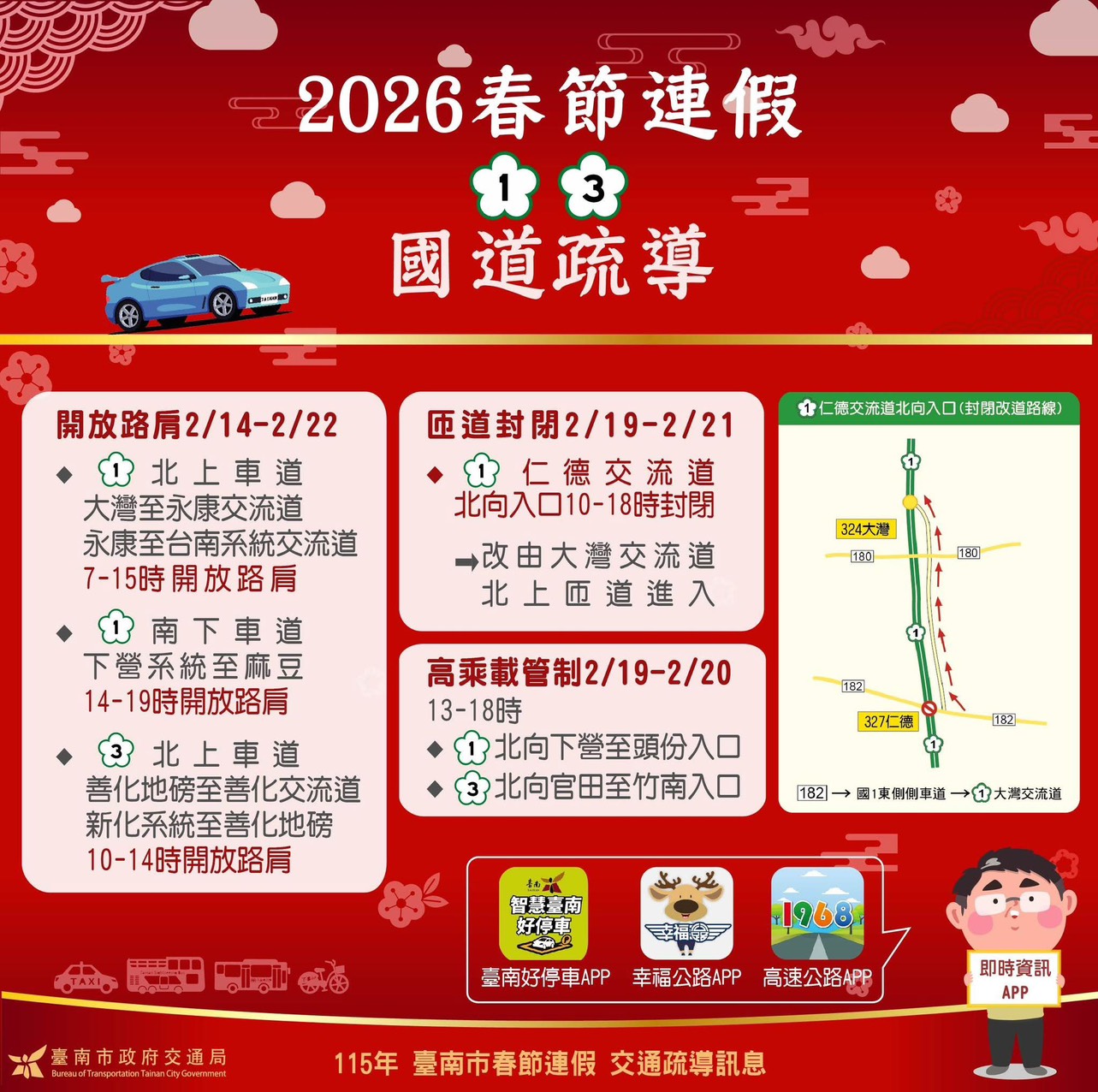 相關高速公路管制措施如下:國道1號仁德交流道北向入口,從2月19日(初三)起至2月21日(初五)止,每日10點至18點將封閉,建議市民朋友可改由高速一街前往大灣交流道,或右轉崑大路銜接永大路前往永康交流道,以避開壅塞路段。