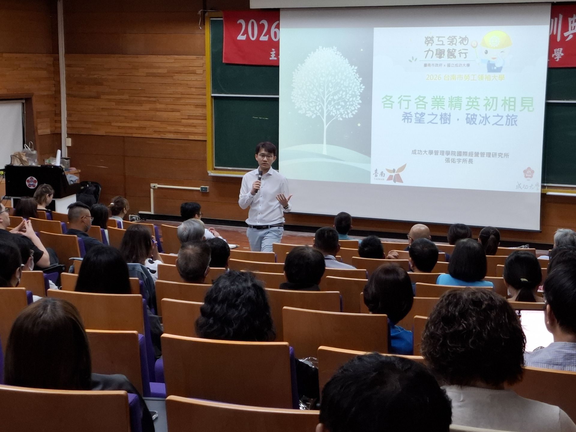 ▲臺南勞工領袖大學今開訓,成功大學研究所所長張佑宇進行演講。(勞工局 提供)